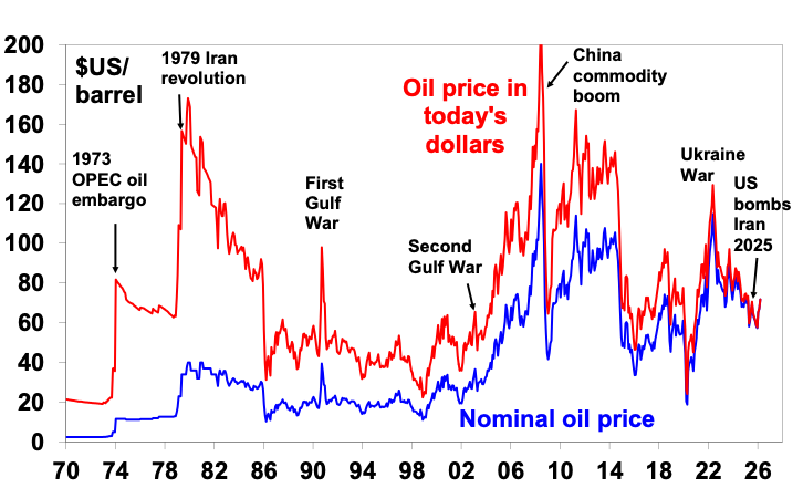 From their highs over $US120 a barrel back in 2022 on the invasion of Ukraine oil prices had fallen sharply and were around a low of $US56 in January after the US intervention in Venezuela. Up till Thursday they had risen to around $US67 as the risk of a strike on Iran increased and have spiked to $US72 today after the start of the war with Iran. This leaves them well below the Ukraine War high and in real terms they remain well below the highs seen on the back of the second oil crisis in 1979 and the commodity boom in 2008. But its early days yet.