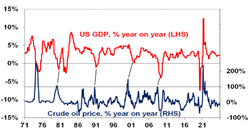 Note: the relationship between oil prices & GDP looks messy over 2020/2021 as oil prices crashed with the pandemic & then rebounded into 2021 but were still low. Source: Bloomberg, AMP