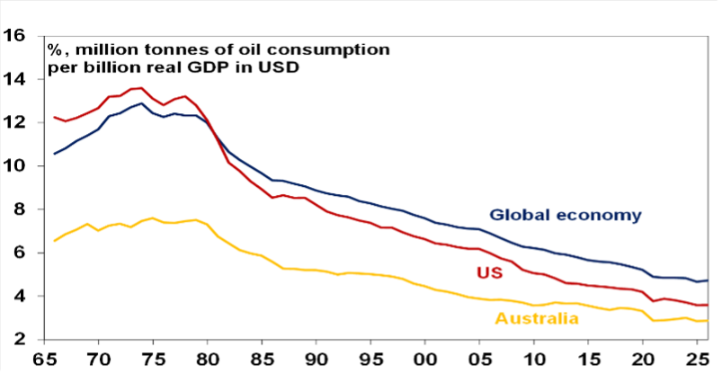 • First, the oil intensity of economic activity has been falling with energy efficiencies and the growth of the services sector. So, the impact of an oil price surge today is less than it used to be.