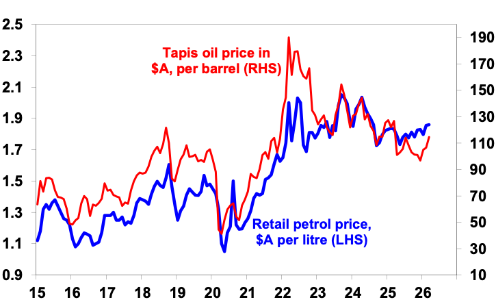 A 40 cents a litre rise in petrol prices would add about 0.8% to CPI inflation, but it would also impart a dampening impact on growth. This is because it would add around $14 a week to the household petrol bill leading to a cut back in spending elsewhere in the economy. In other words, it will act as a tax on households.