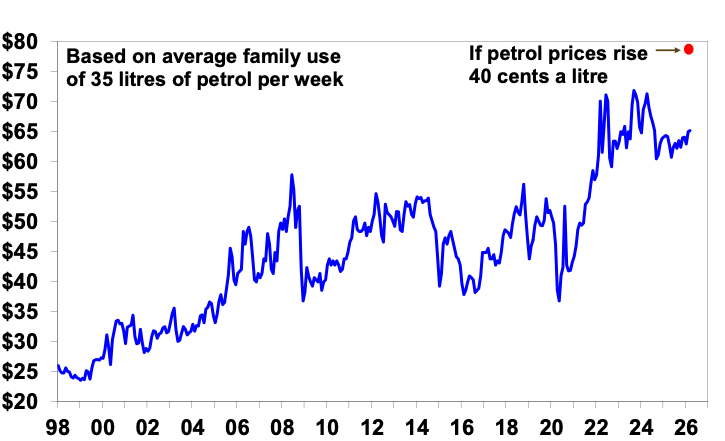The main way Australians will feel the impact of the war is via higher petrol prices. Australian petrol prices track the Asian Tapis oil price closely & Tapis tracks US oil prices. This is because our prices are set globally – to which is then added tax, transport costs & margins. Roughly speaking each $US1 a barrel rise in oil prices adds around a cent a litre to petrol prices. So, a $US40 a barrel rise in world oil prices taking them above $US100 a barrel would add around 40 cents a litre with a 7-10 day lag if sustained.